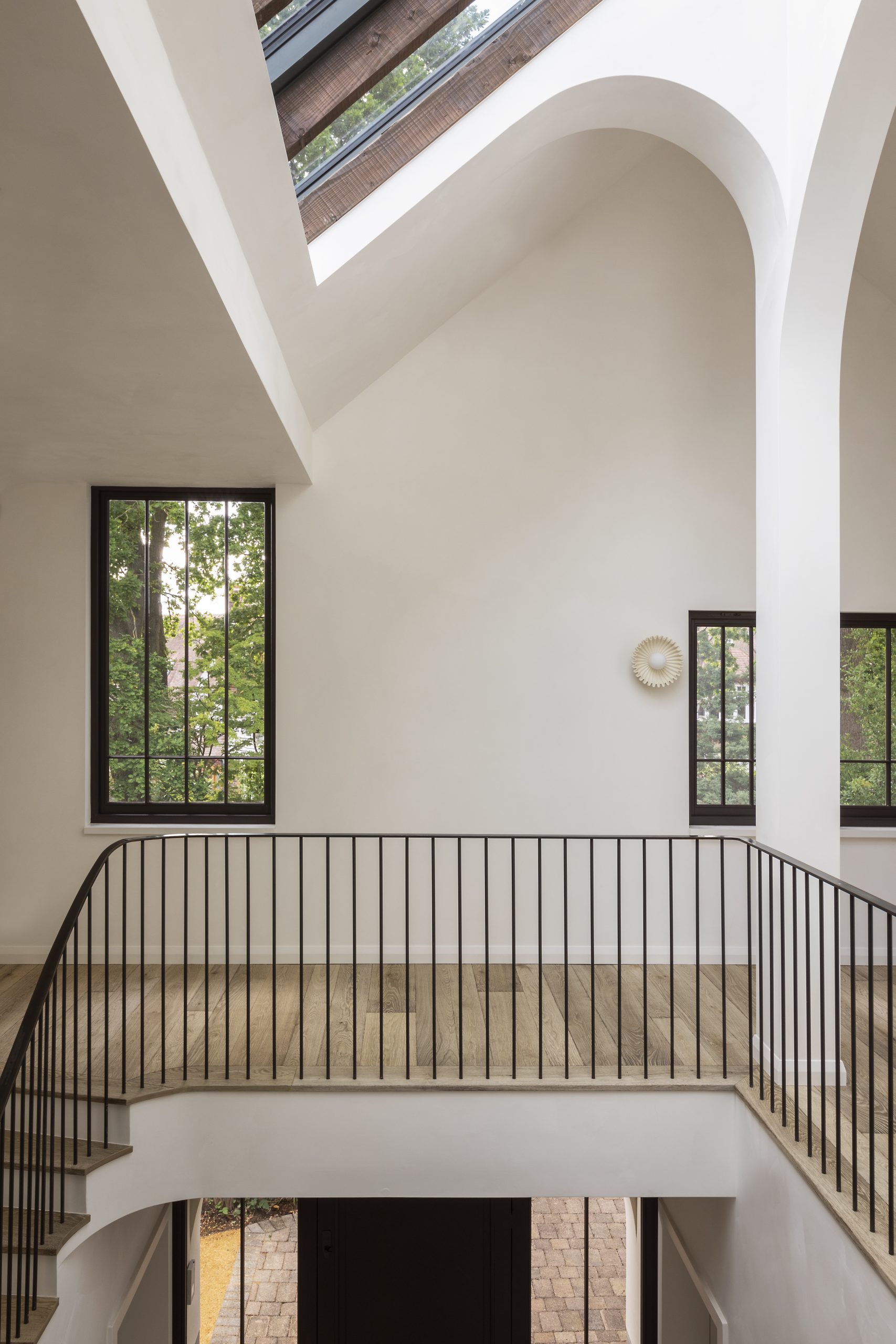 A standout feature is the incredible arched window in the kitchen, which commands the room, while framing a cluster of cypress trees. This majestic window stands 3.3m tall, split into two parts with side hung openers on the bottom and fixed sashes on the top. The internal finish is Farrow & Ball No. 79 Card Room Grey, which pairs beautifully with the trees outside and the finishes and colours inside.